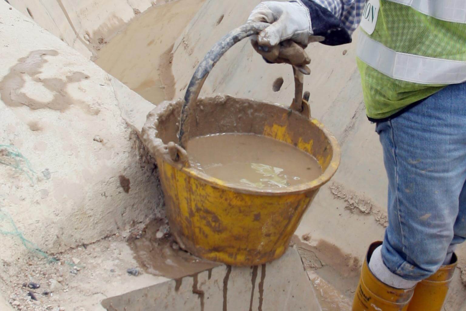 Construction workers clearing a silt dump at a construction site.
