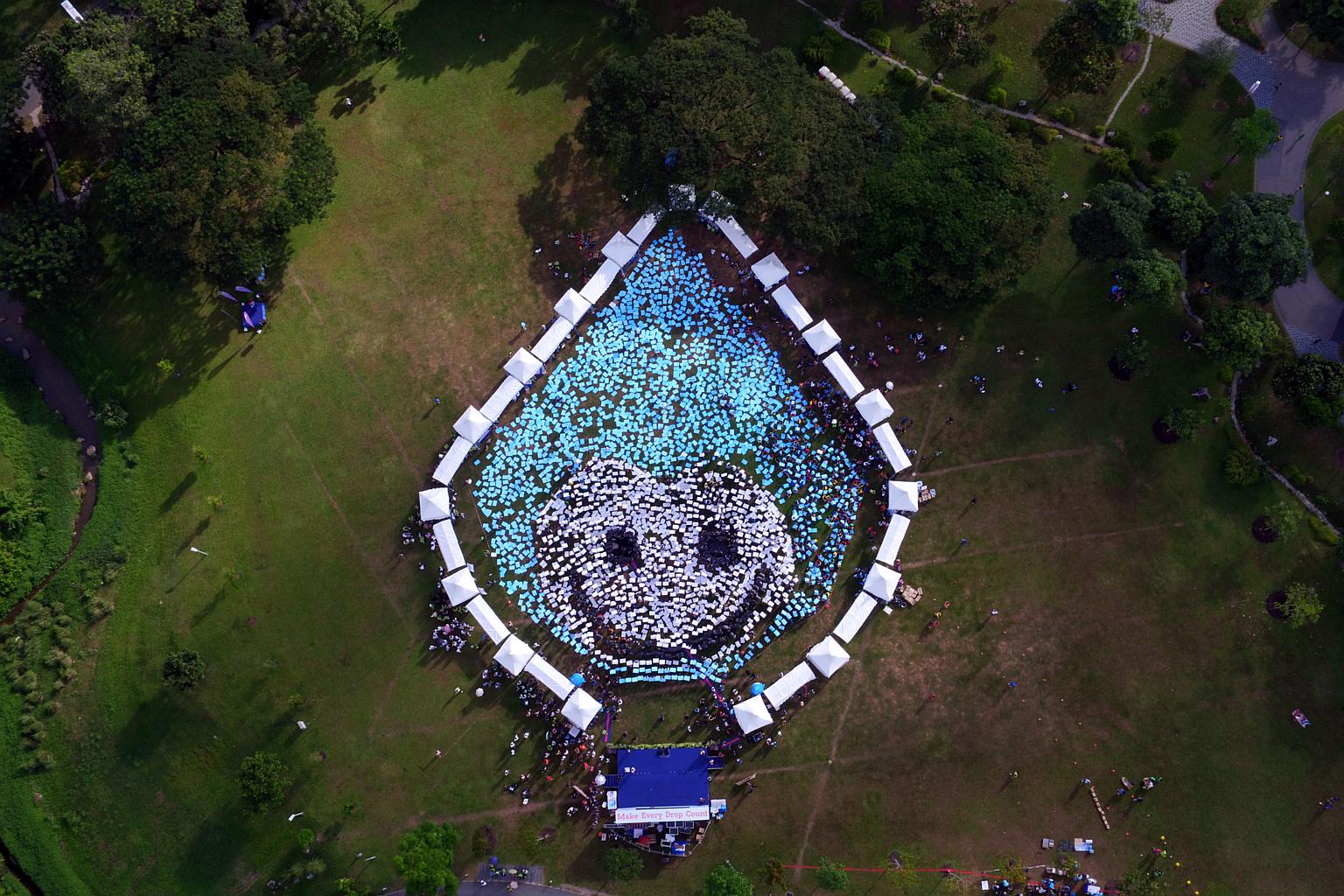 Aerial photo of Water Wally formation at the Singapore World Water Day 2016 Opening Ceremony at Kallang River @ Bishan-Ang Mo Kio Park.