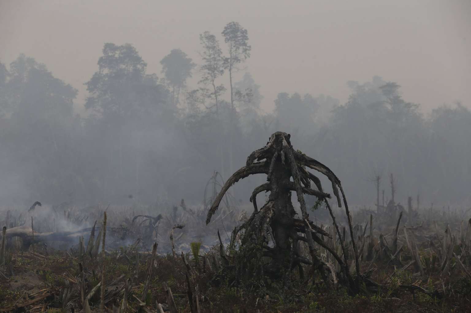 The root of a tree is seen in a burnt palm plantation area near Tanjung Siapi Api port in Palembang, on the Indonesian island of Sumatra.