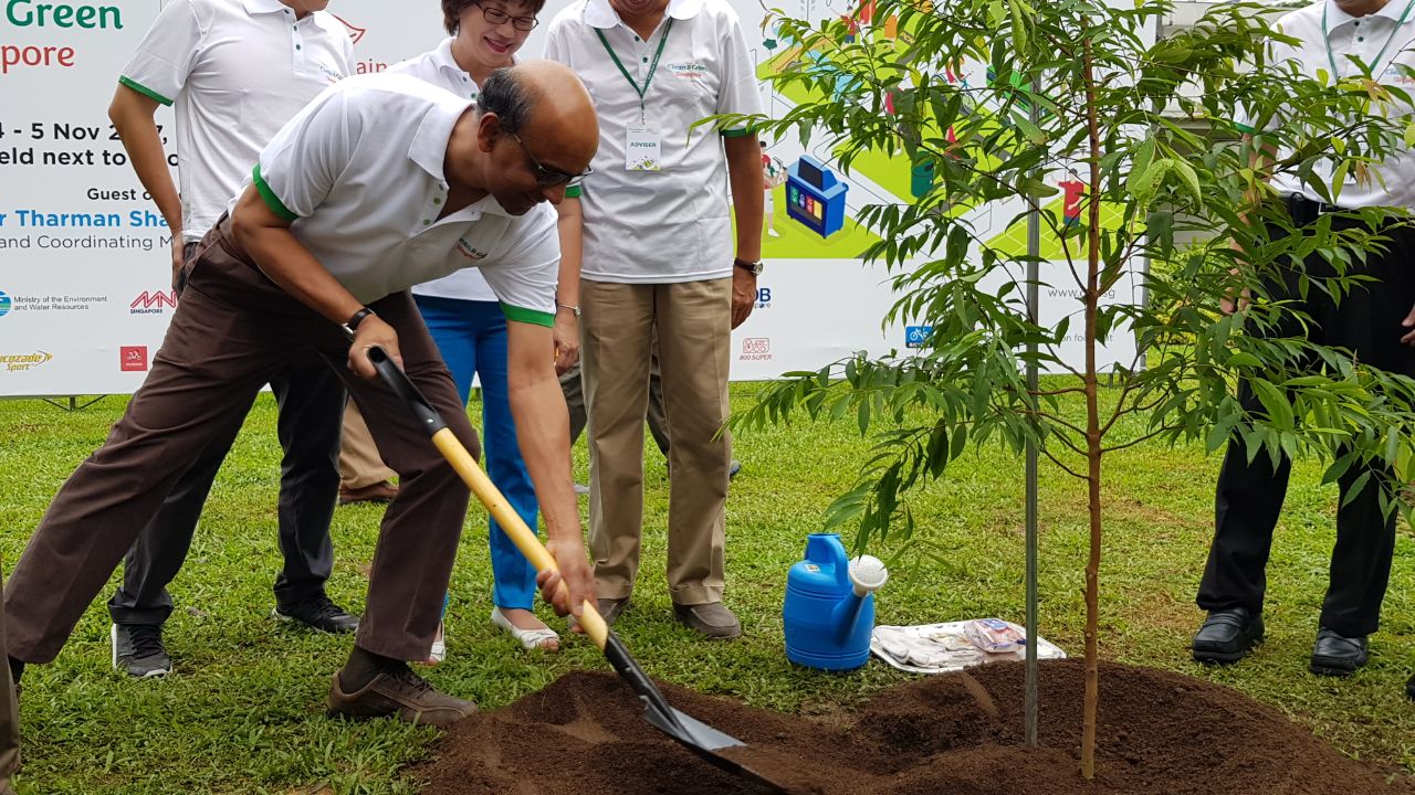 DPM Tharman Shanmugaratnam planting a tree at the annual Clean and Green carnival on Nov 4.