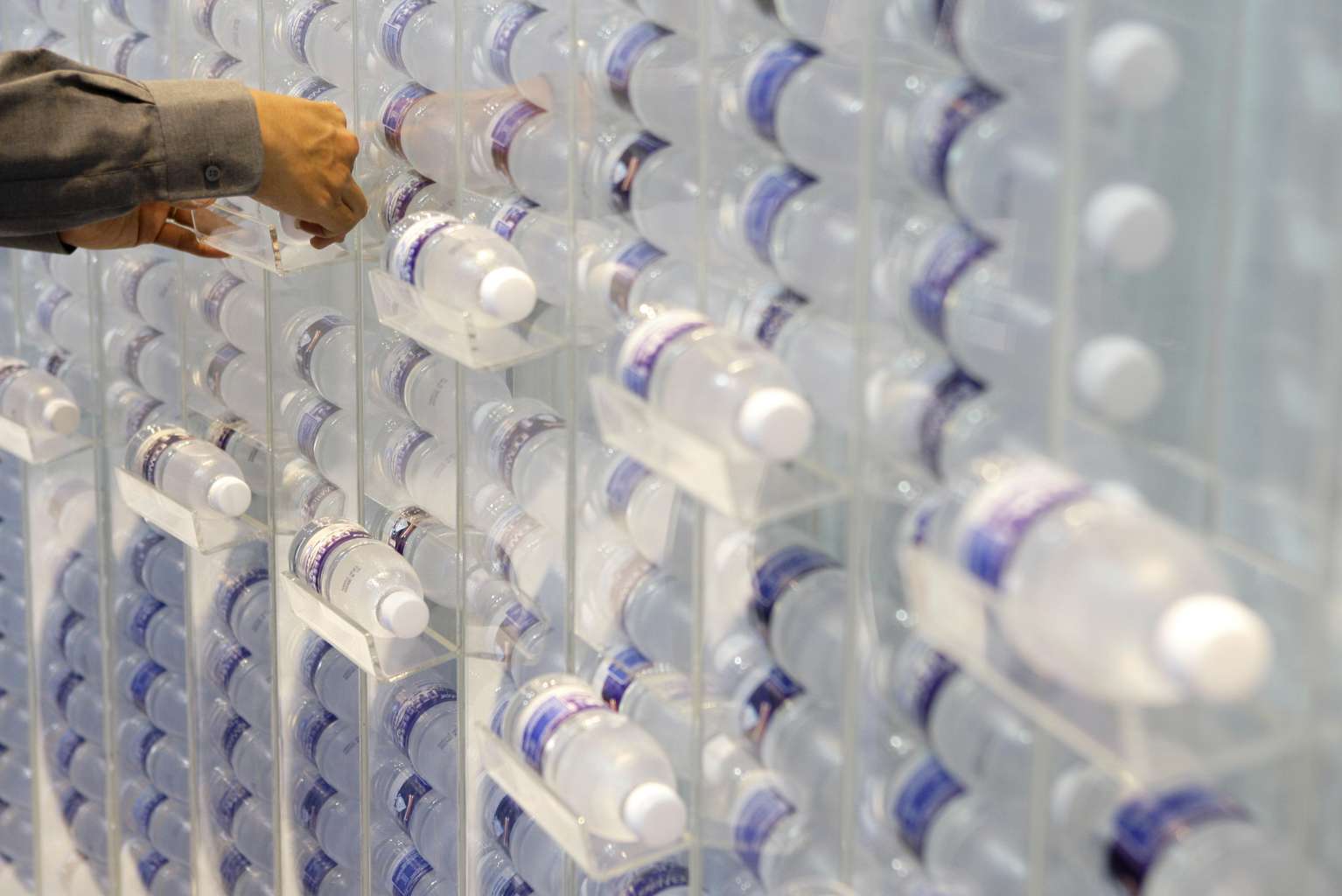 A booth attendant displays a bottle of NEWater during Singapore International Water Week, on June 26, 2008.