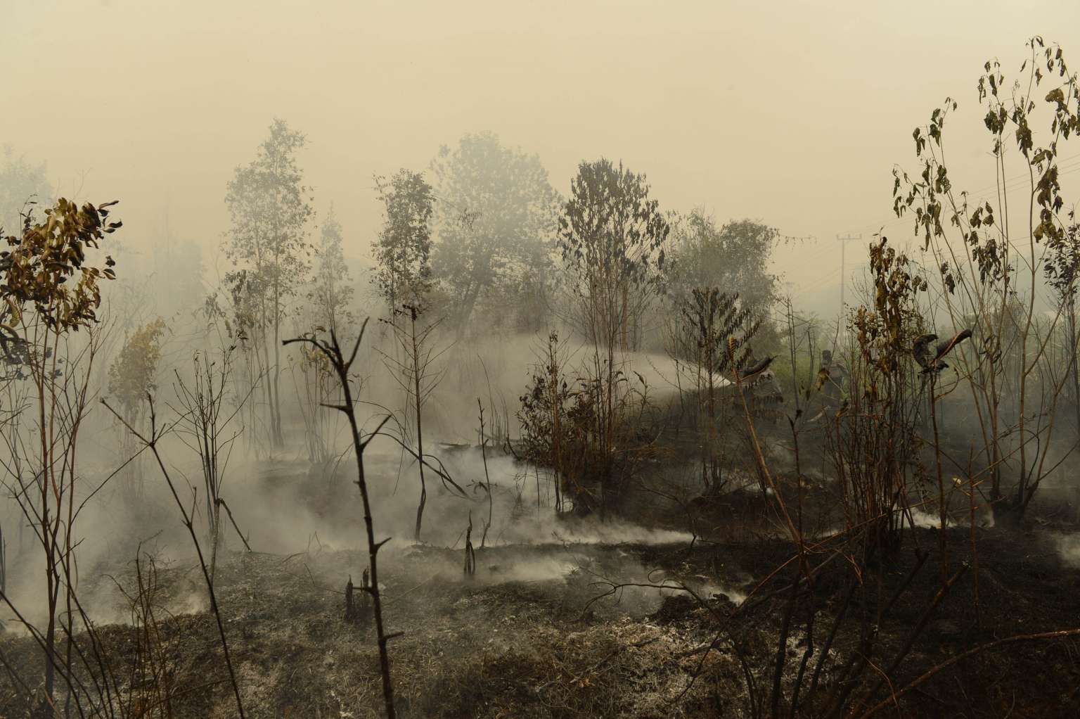 Indonesian police and firefighters extinguishing a fire on burning peat land in Kapuas, Central Kalimantan, on Sept 24, 2015.