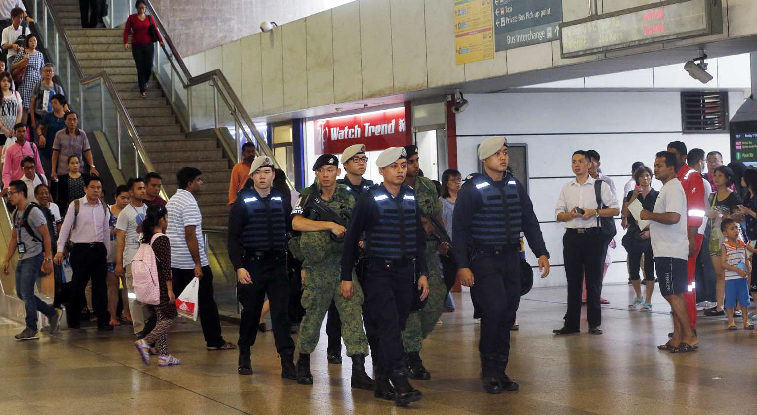 Public Transport Security Command police officers and SAF soldiers patrolling Jurong East MRT station on Oct 17, 2016.
