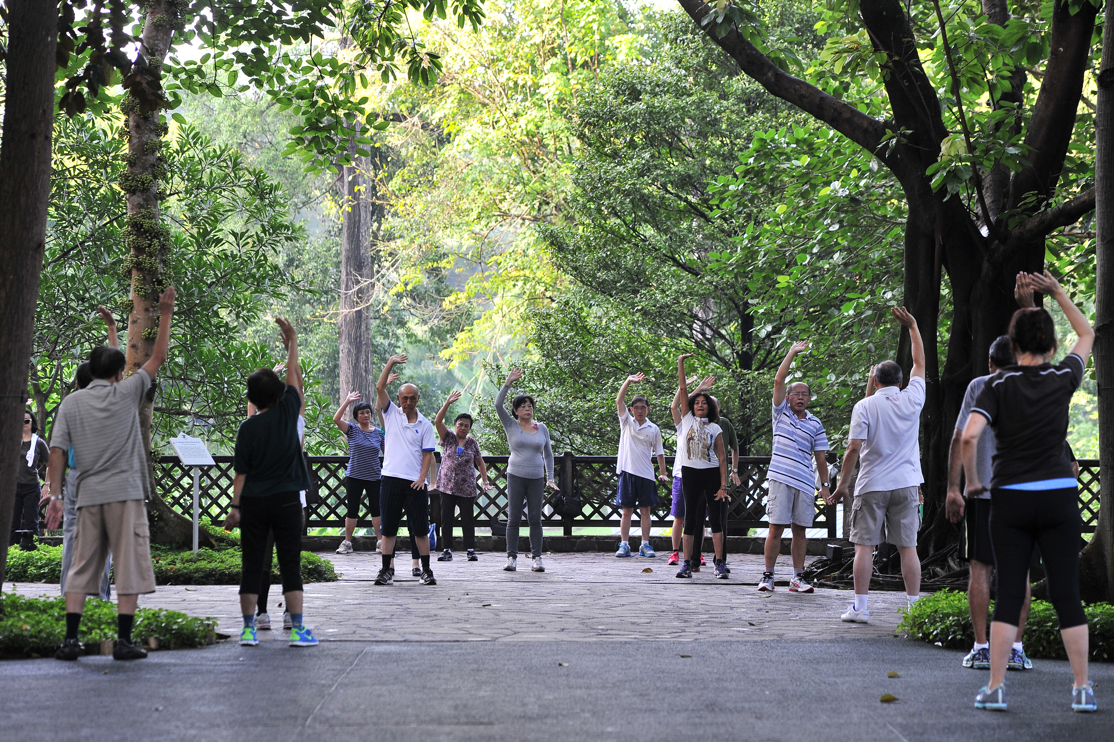 A group of people exercising at the Botanic Gardens’ Palm Court.