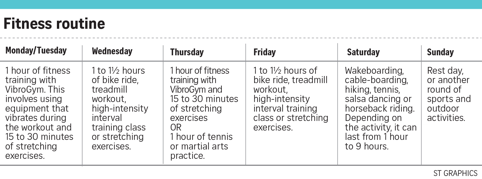 Food columnist Victoria Cheng works out twice a week with VibroGym equipment because the vibrating movements help her achieve results more quickly. Her routines vary through the week, with bike rides, tennis, wakeboarding, martial arts and salsa dances all adding to her efforts to keep fit.