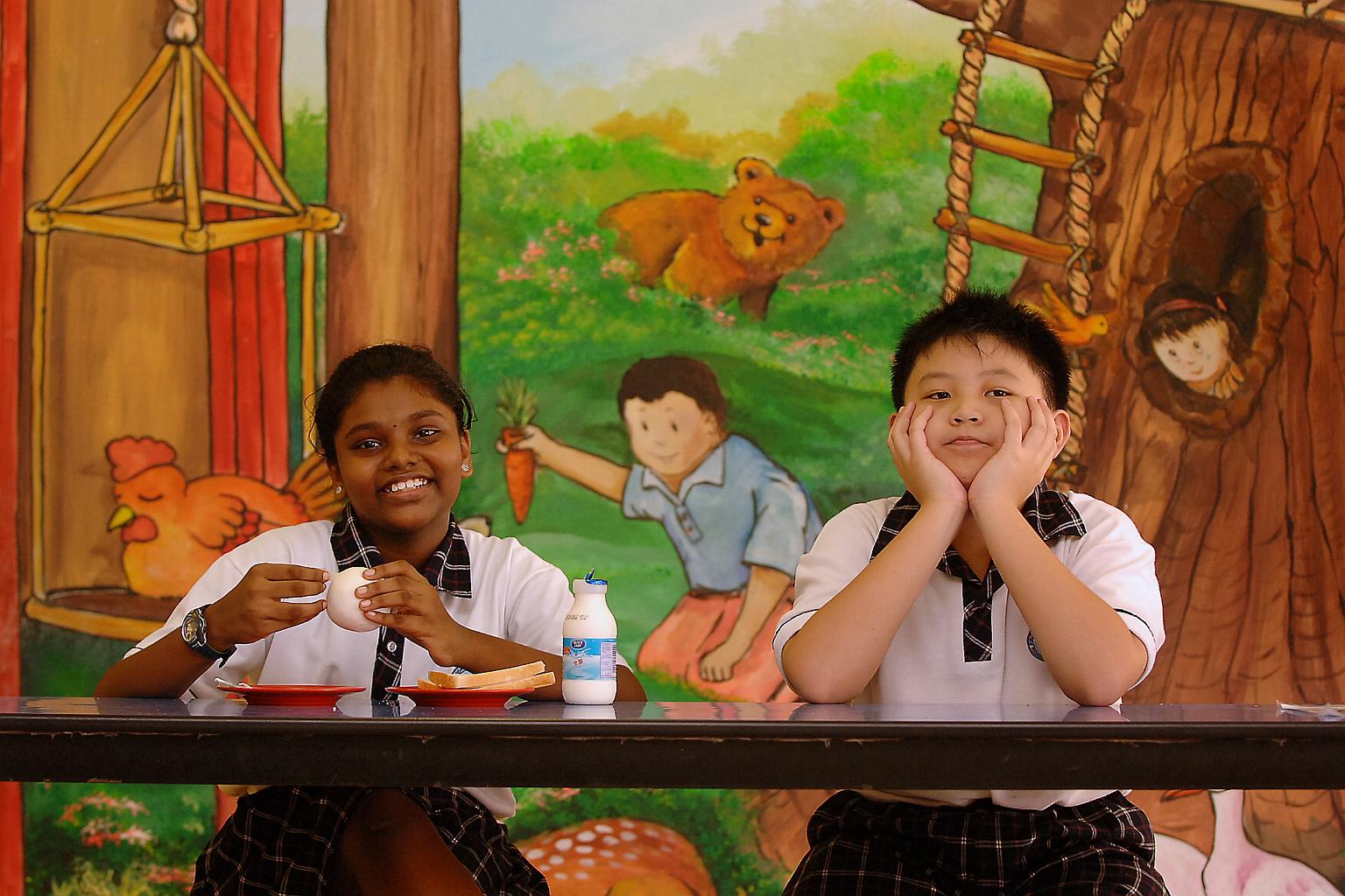 Bukit View Primary students (from left) Yao Wenqi and R.Rajeshree love their breakfasts, having bread and a glass of milk daily.
