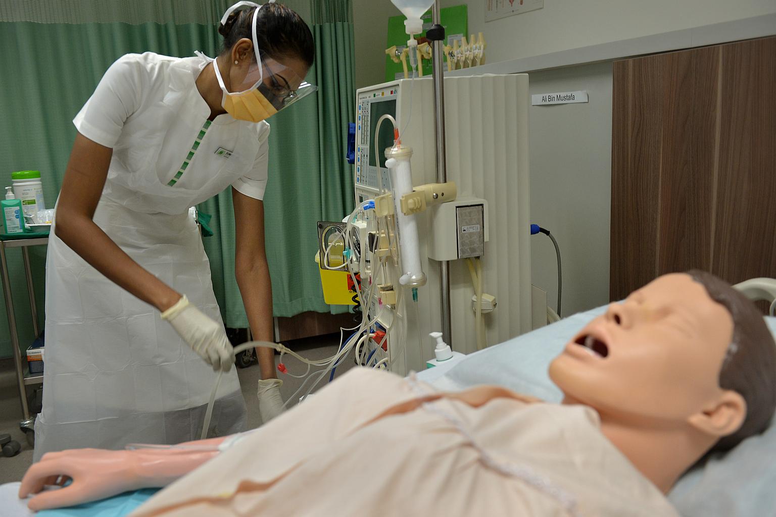 A nurse demonstrating infection control measures taken when a patient undergoes dialysis at SGH's Renal Dialysis Centre.