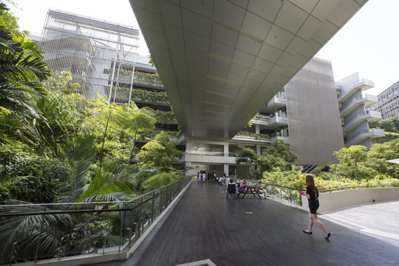The hospitals' fan-shaped wards with windows for each patient increase ventilation, with planters providing a green view. There are also 15 gardens, including one for intensive-care unit patients, and ward towers are orientated to optimise day lighting while reducing glare.