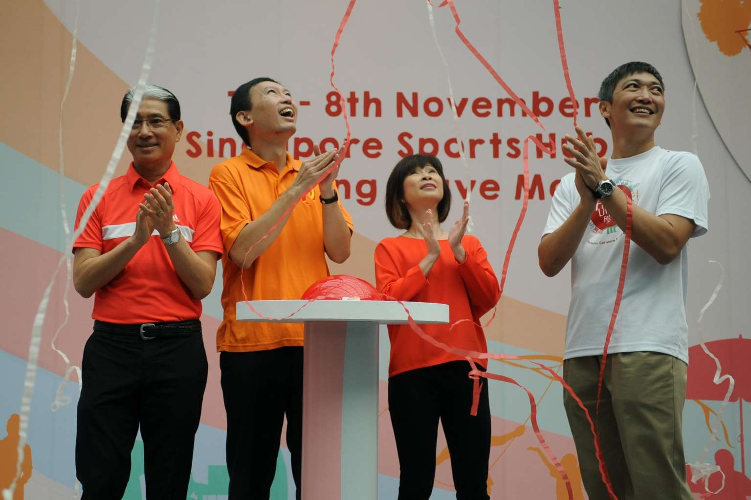 (From left) Mr Lucas Chow, Mr Chee Hong Tat, Dr Amy Khor and Mr Zee Yoong Kang doing the opening ceremony of the Healthy Lifestyle Festival SG Anchor Event.