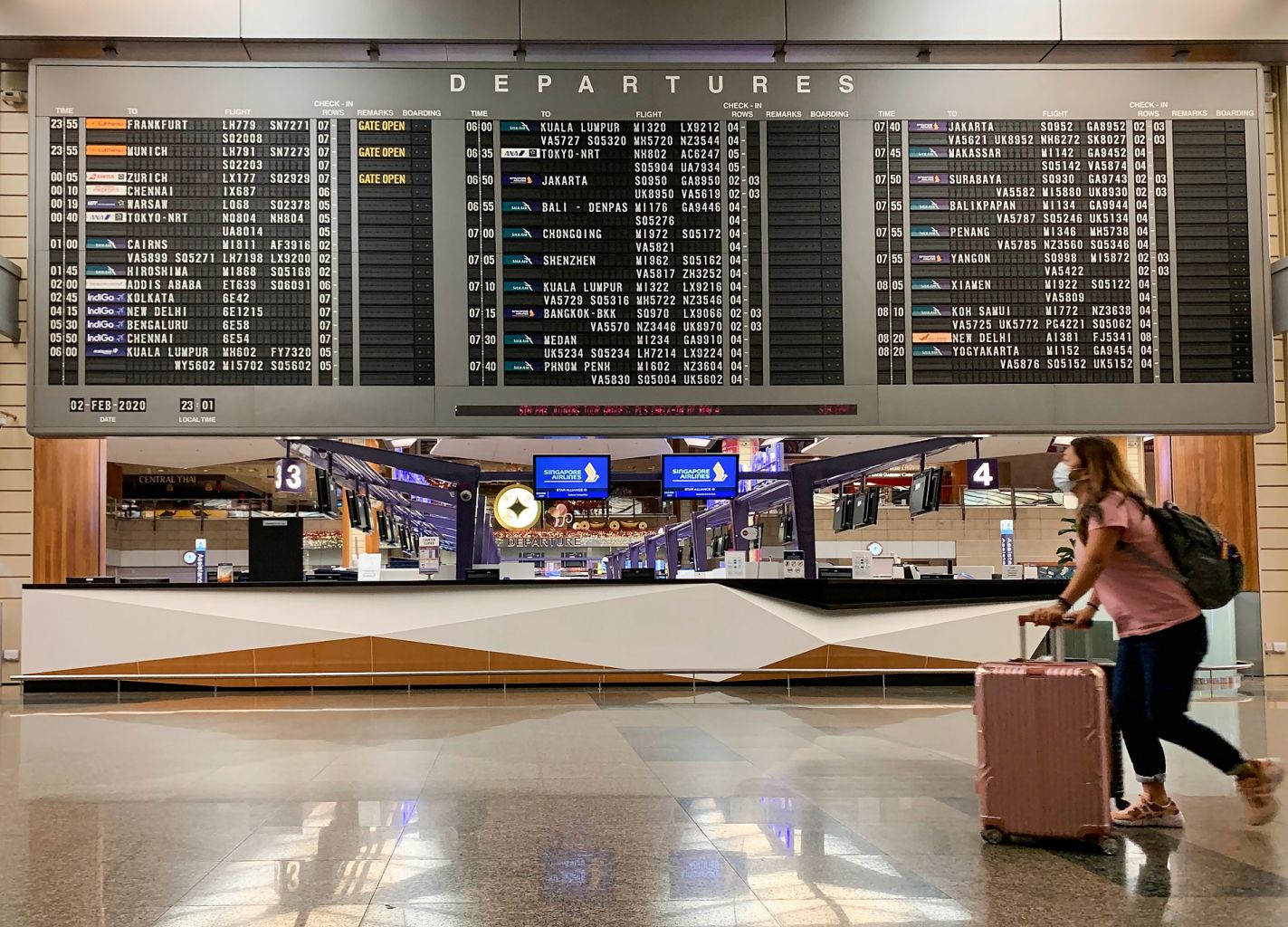 A traveller wearing a surgical mask pushes her suitcase at the Departure Hall of Changi Airport Terminal 2.