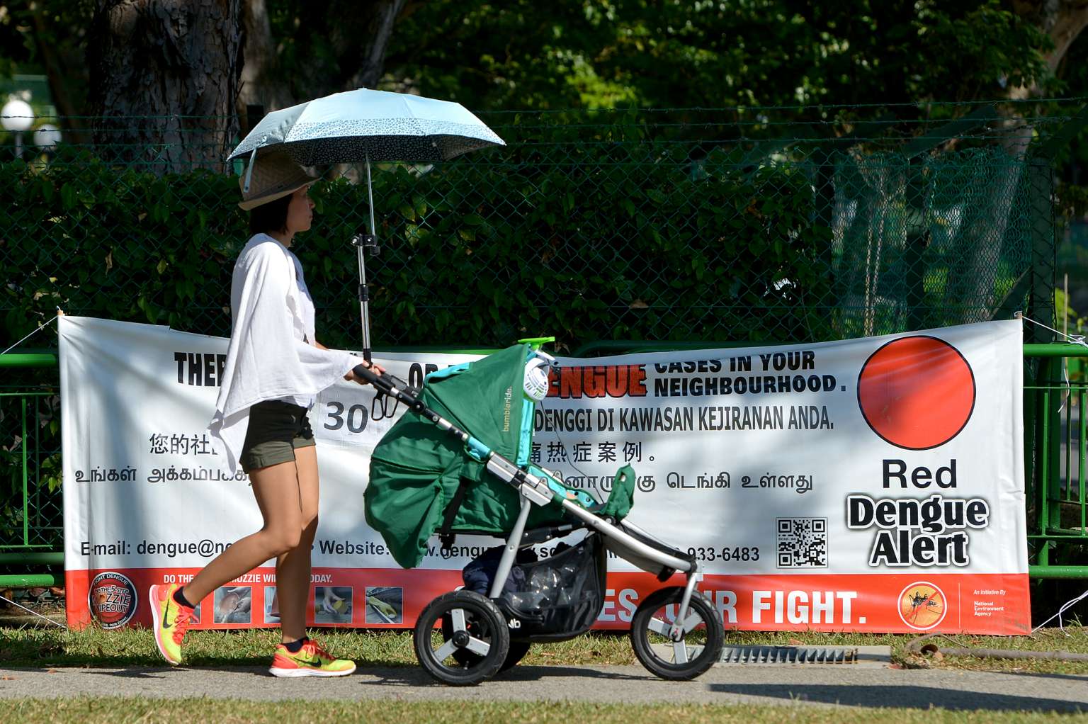 A woman pushes a stroller past a banner warning residents about dengue at Dunbar Walk.