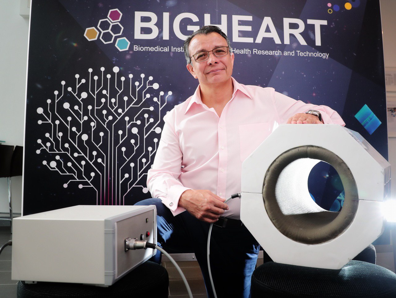 Associate Professor Alfredo Franco-Obregon with the device MRegen, which targets the muscles in a user's leg with a specific magnetic signature and creates metabolic activity in the cells similar to when a person exercises.
