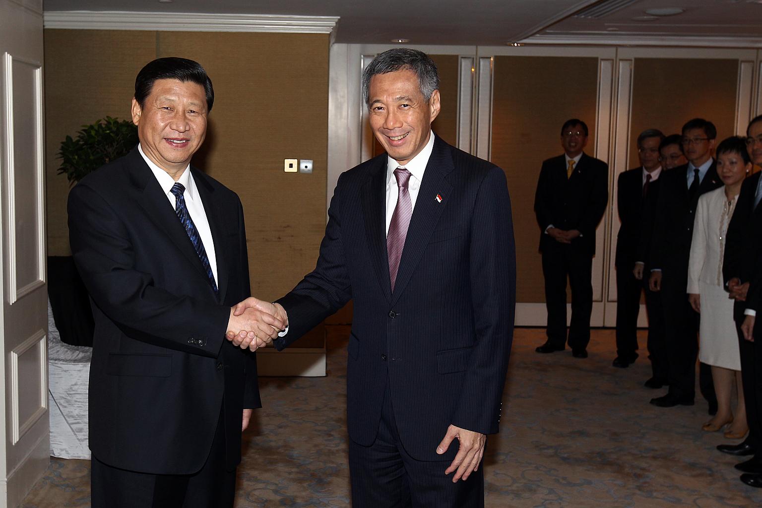Xi Jinping (left) shaking hands with Prime Minister Lee Hsien Loong at the Shangri-La Hotel on Nov 15, 2010.