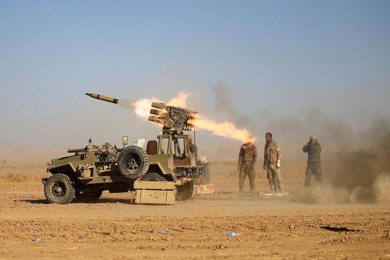 Shi'ite fighters fire a rocket towards Islamic State militants during a battle with ISIS soldiers at the airport of Tal Afar west of Mosul, Iraq on Nov 18, 2016.
