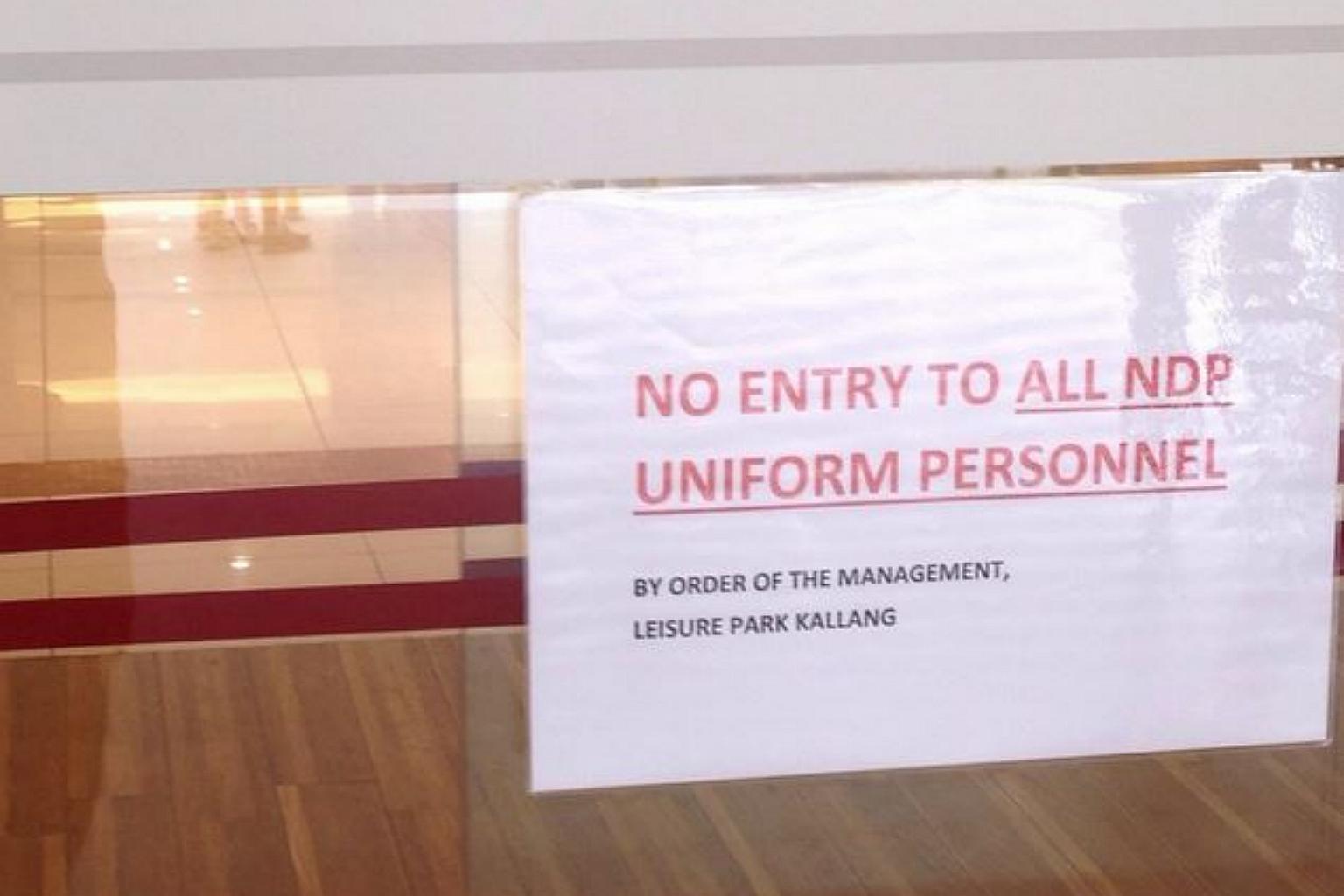 The sign at Leisure Park Kallang, reading "No entry to all NDP uniform personnel", received hundreds of comments after being posted on Facebook and online forums.