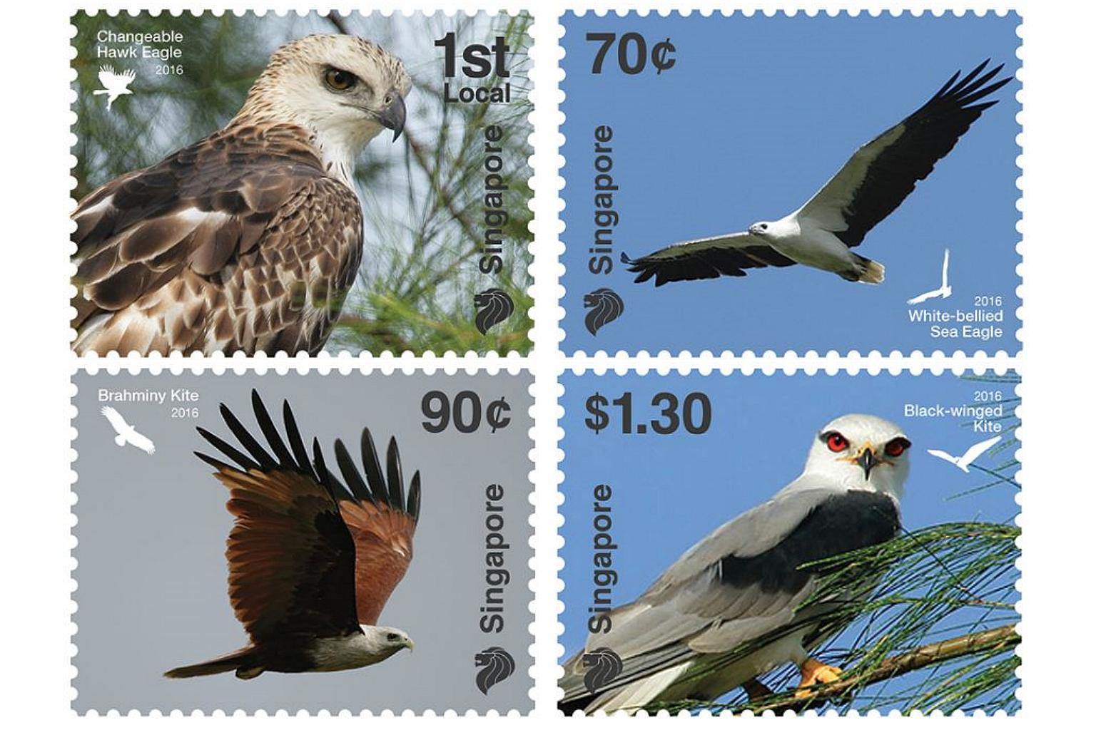 Singapore Post's four-stamp set includes a 70-cent stamp with Singapore's largest native raptor, the white-bellied sea eagle; a 90-cent stamp with the Brahminy kite; and a $1.30 stamp showing a perched black-winged kite.