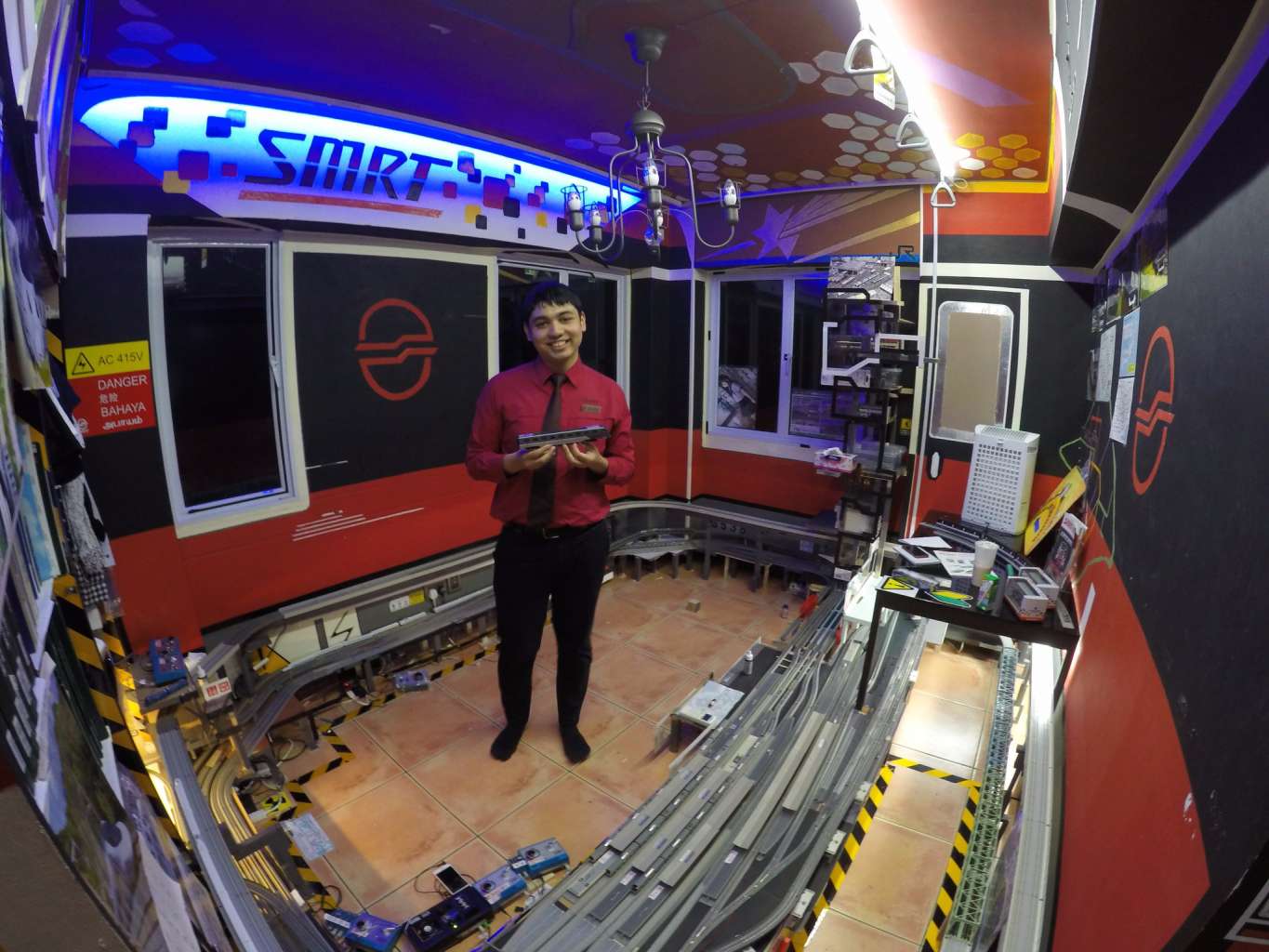 The room's train set-up was inspired by his workplace, Jurong East station, and features multiple platforms and landmarks such as shopping malls Jem and JCube.