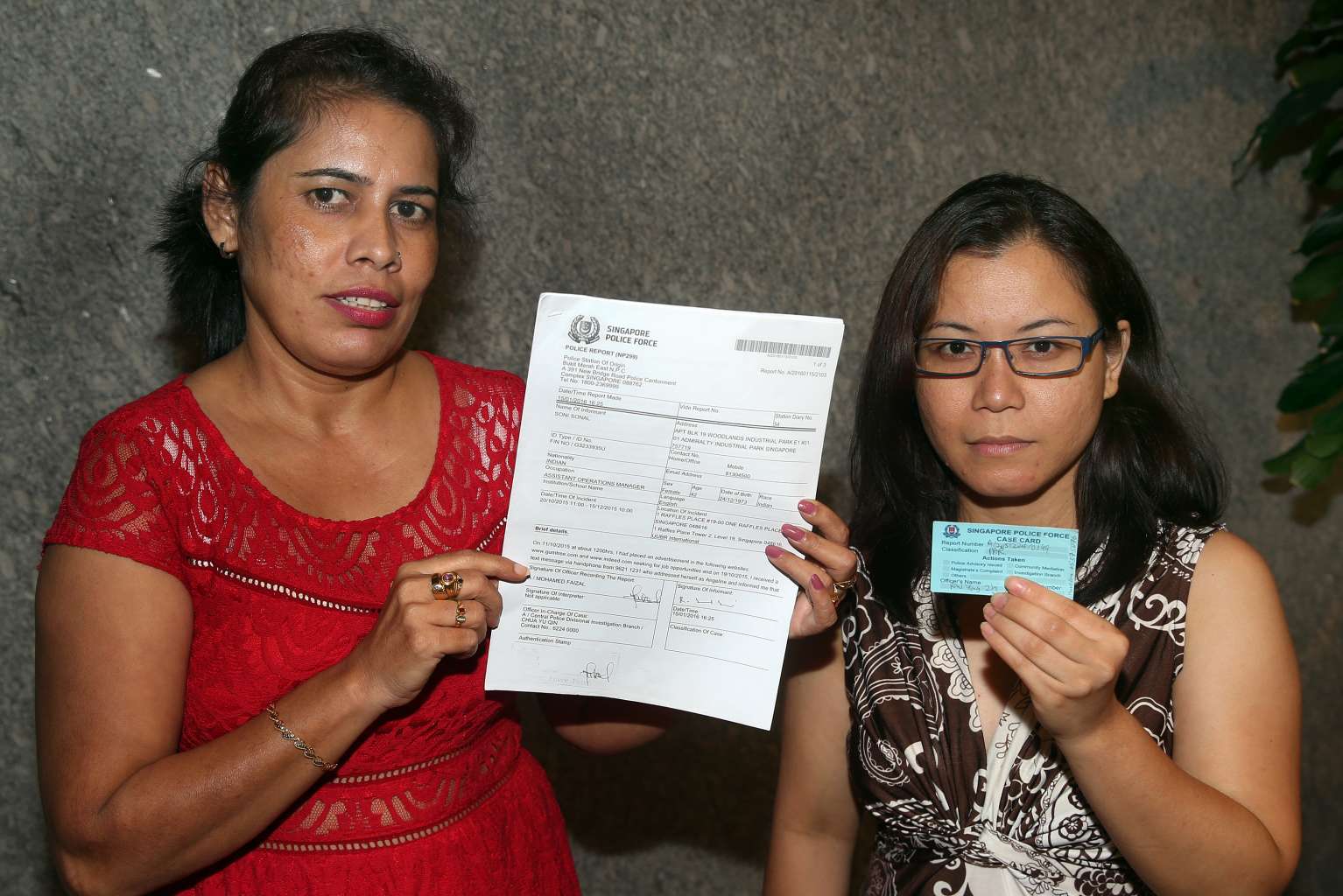 Soni Sonal (left) and Donah Grace Requino holding evidence of the police reports they made against Asia Recruit, Asiajobmart and UUBR International.