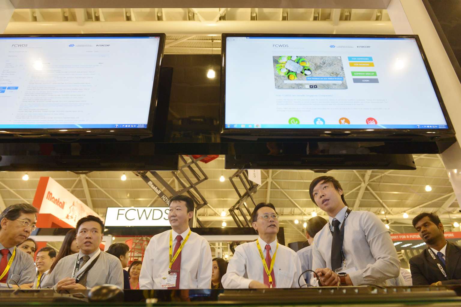 Intercorp business and product development consultant Kelvin Koh (right, in white shirt) demonstrating how the Foreign Construction Worker Directory System works to BCA chairman Quek See Tiat (second from right) and Scal president Kenneth Loo (third from right) at the BuildTech Asia conference on Oct 13, 2015.