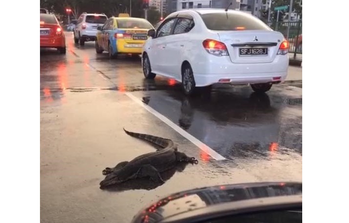 There was a slight traffic jam as vehicles slowed to avoid running over the creature, which Mr Foo said could have come from a nearby canal.