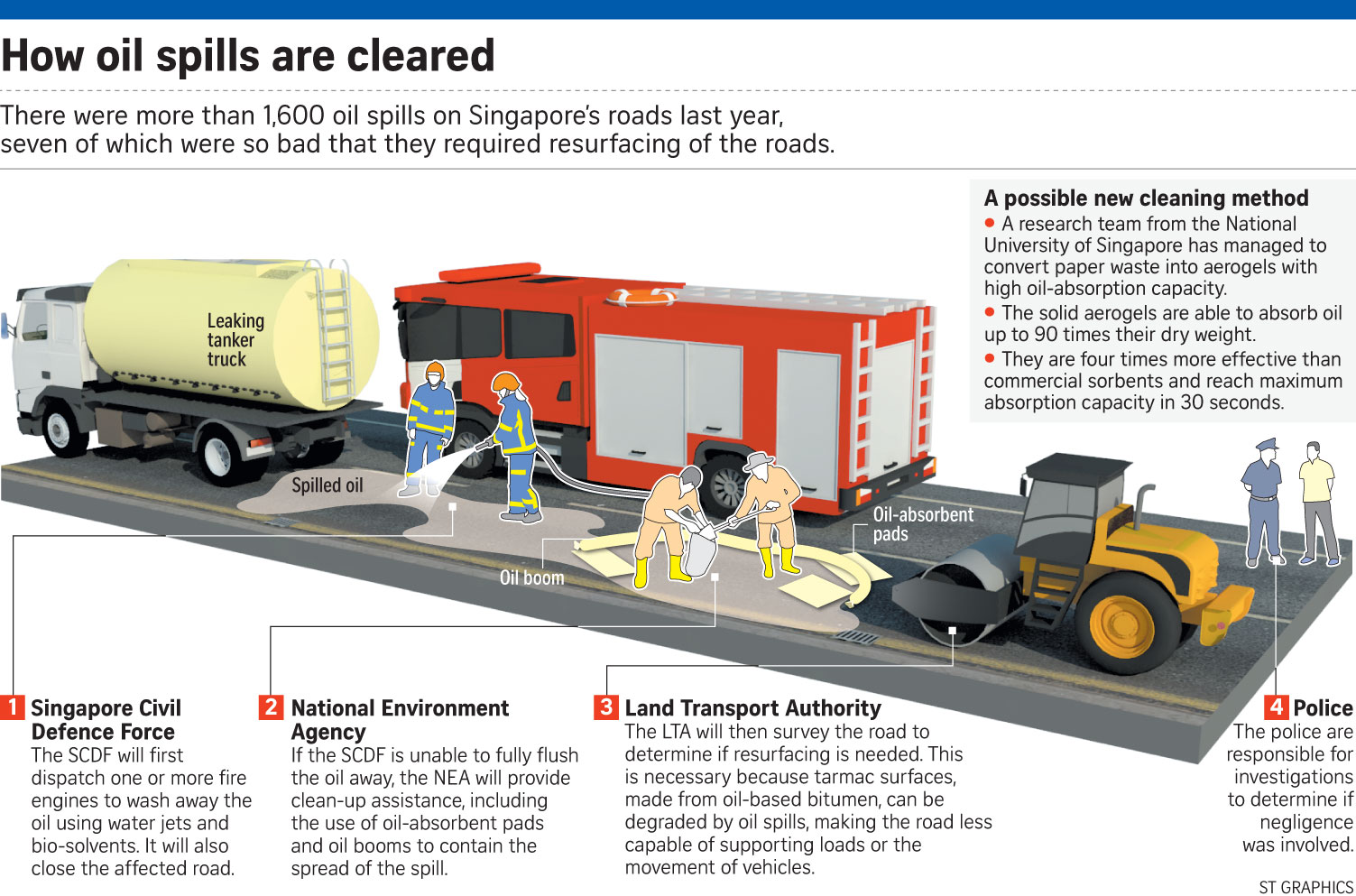 Before a road is resurfaced, various agencies, including the SCDF and National Environment Agency (NEA), will attempt a preliminary clean-up. The SCDF will first dispatch one or more fire engines to wash away the oil using water jets and bio solvents. It will also close the affected road.