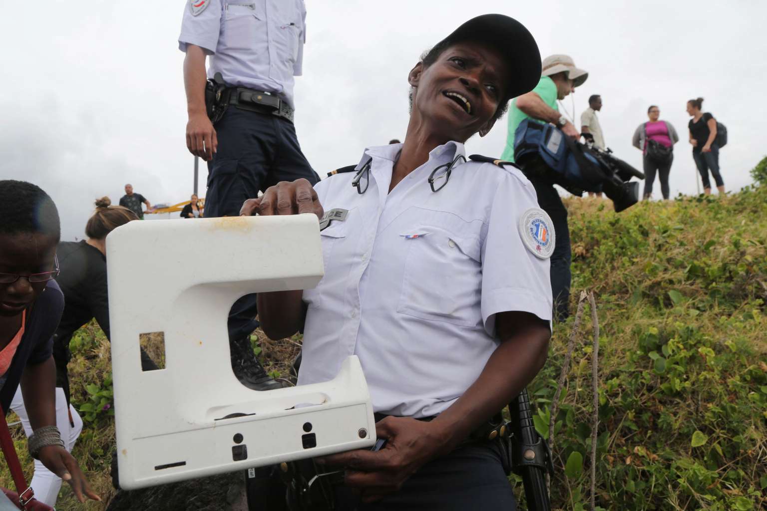 A police officer holds a piece of plastic found on the French Indian Ocean island of La Reunion on Aug 4, 2015.