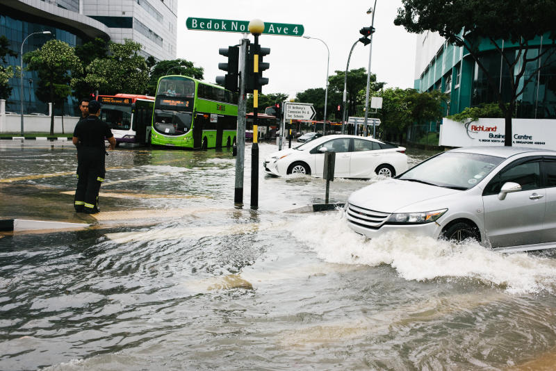 Vehicles at the flooded junction of Upper Changi Rd and Bedok North Avenue 4 on Jan 8, 2018.