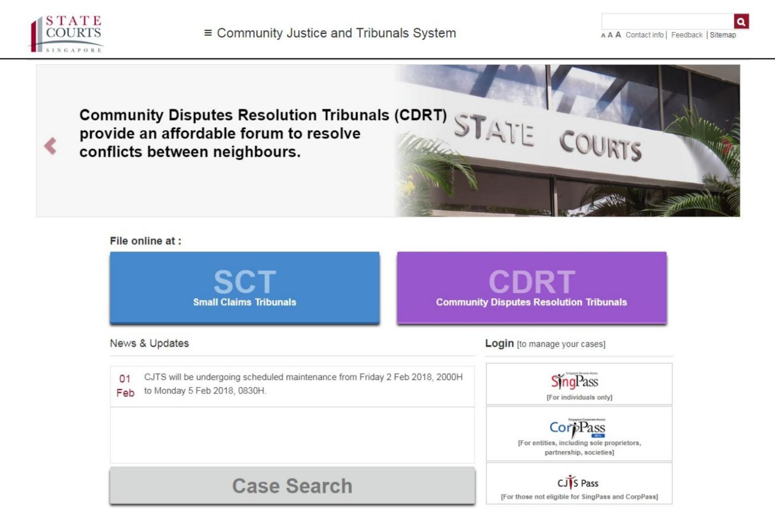 Individuals can access the Community Justice and Tribunals System with their SingPass, while corporate entities can do so with their CorpPass. Pre-filing assessments and case search functions do not require a login with SingPass or CorpPass.