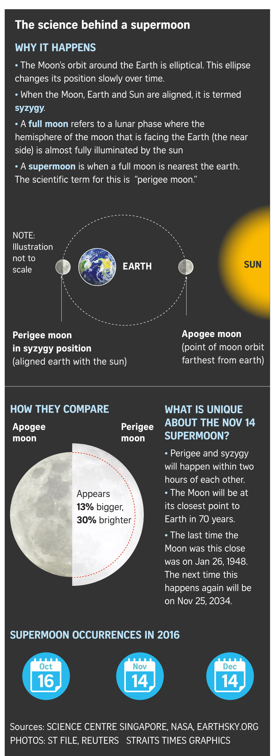 In Singapore, the Moon will rise in the east at 6.46pm on Nov 14 and become a full moon at 9.52pm. It will be nearest to Earth about two hours before that.