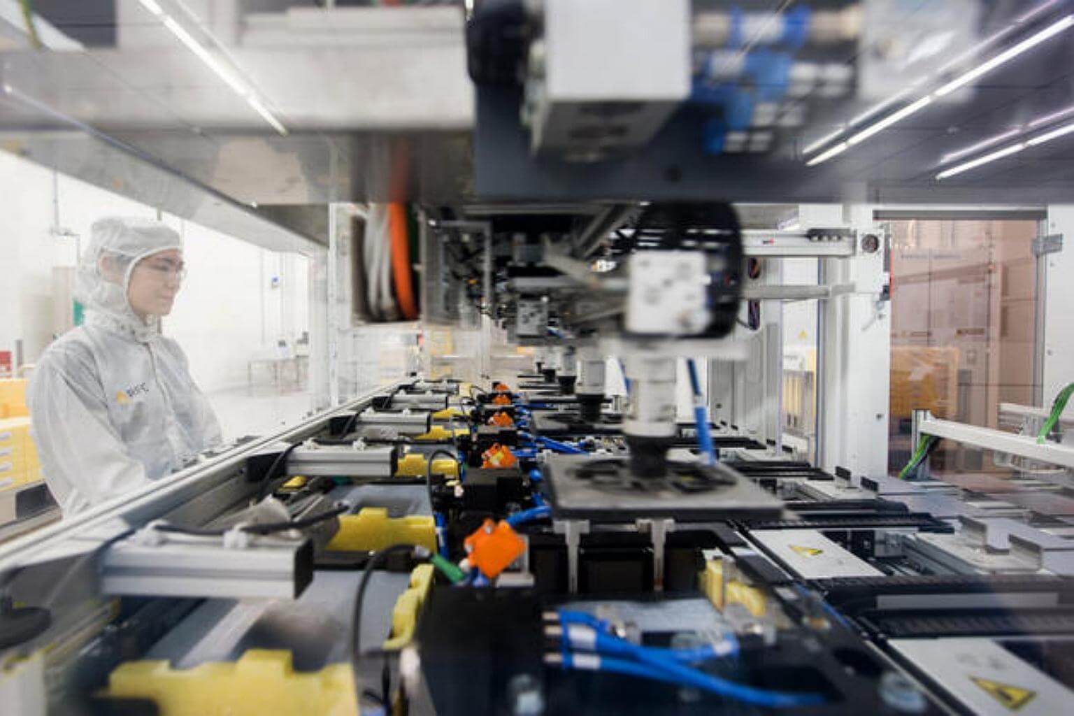 An employee works on the cell production line at the REC Solar ASA manufacturing plant in Singapore on Sept 5, 2014.