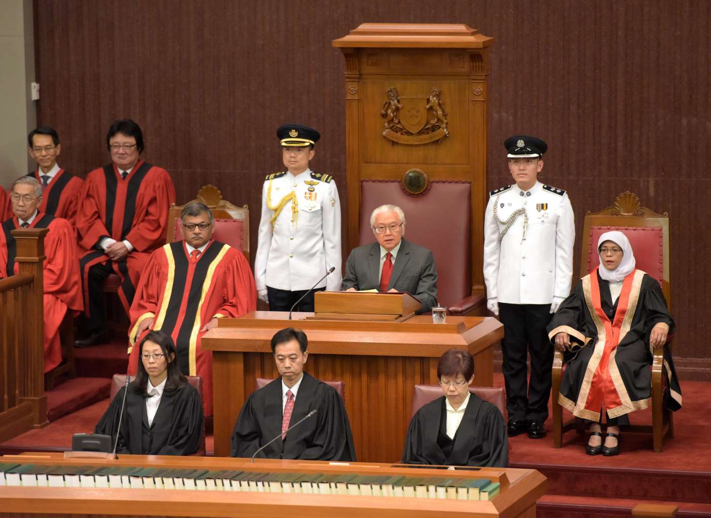 President Tony Tan Keng Yam opening the first session of the 13th Parliament, flanked by Chief Justice Sundaresh Menon (at far left) and Speaker of Parliament Halimah Yacob on Jan 15, 2016.
