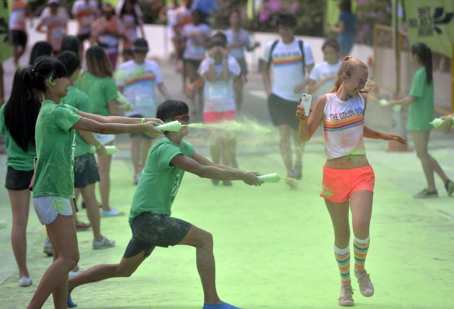 A participant getting splashed with green-coloured powder during the Colour Run held on Aug 30, 2014.