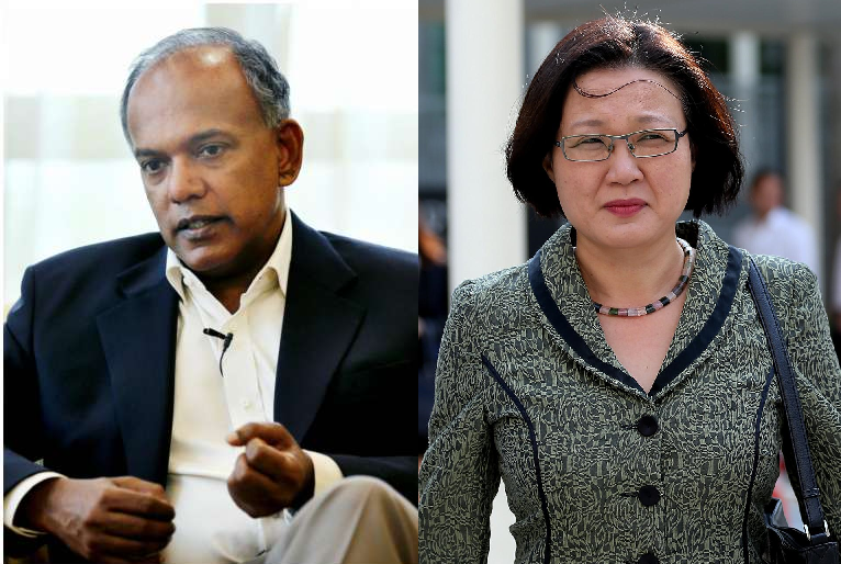 Law Minister K. Shanmugam and Workers' Party chairman Sylvia Lim.