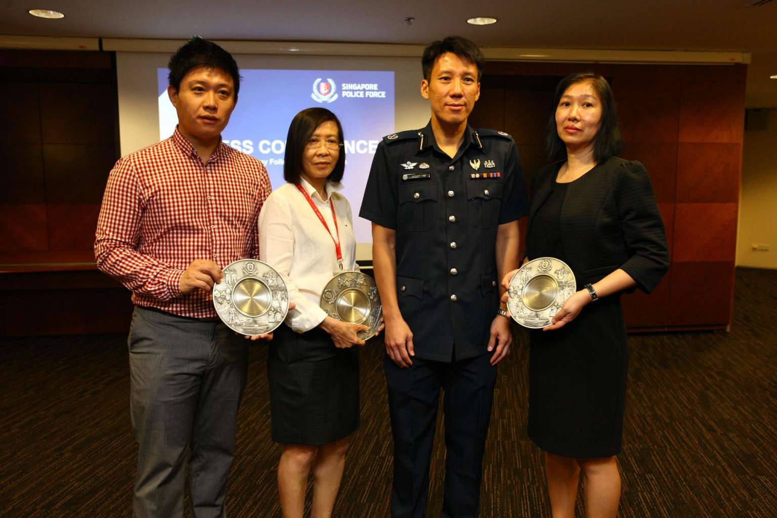Commander of Central Division, Deputy Assistant Commissioner of Police Arthur Law (second from right) with Hanshan Money Express staff (from left) Li Shu, Thng Koon Eng and Clara Ong (who is receiving it on behalf of her colleague Ms Han).