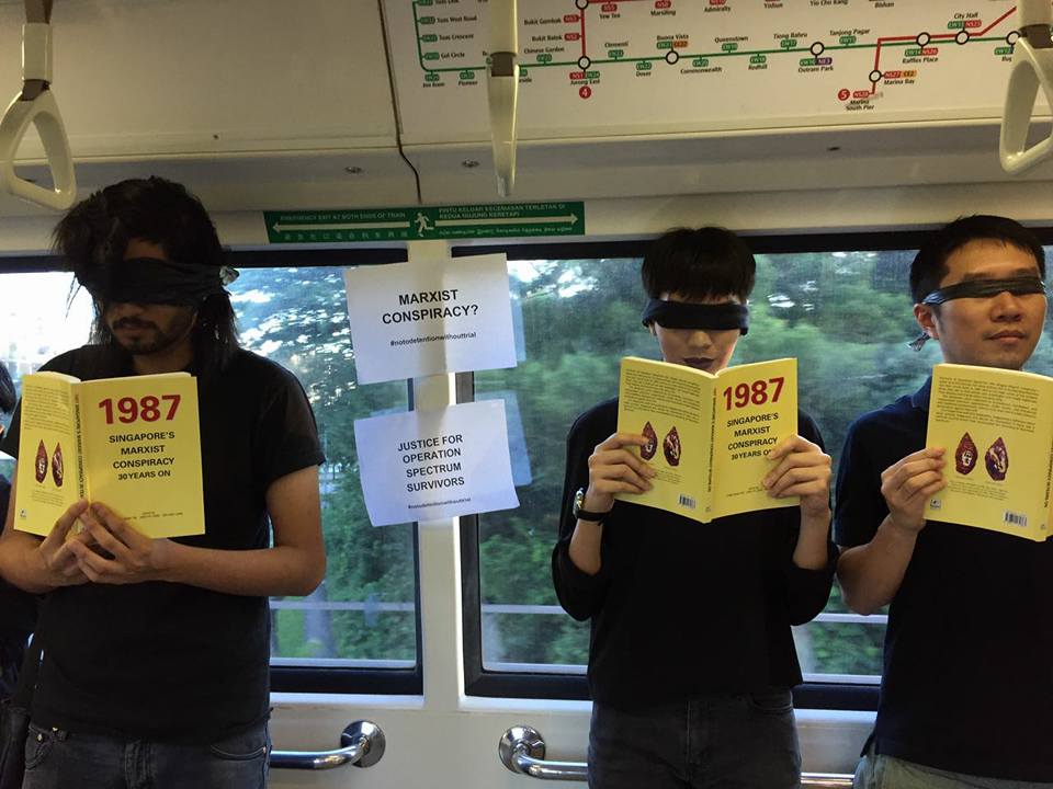 A group of about seven people were seen riding a train on the North-South Line while holding copies of the book and wearing blindfolds in a silent protest. Social activist Jolovan Wham had posted pictures of it on Facebook on Saturday.
