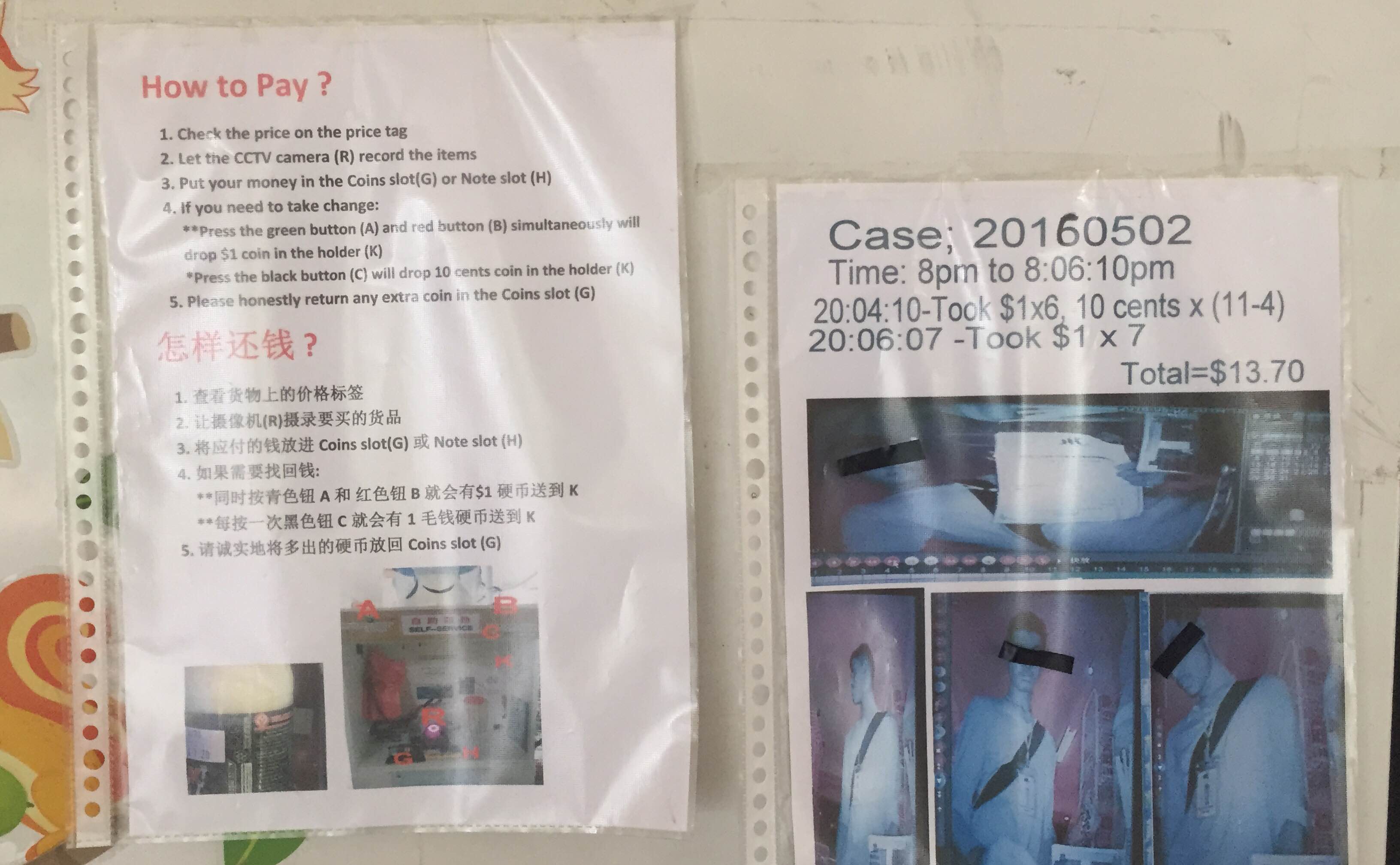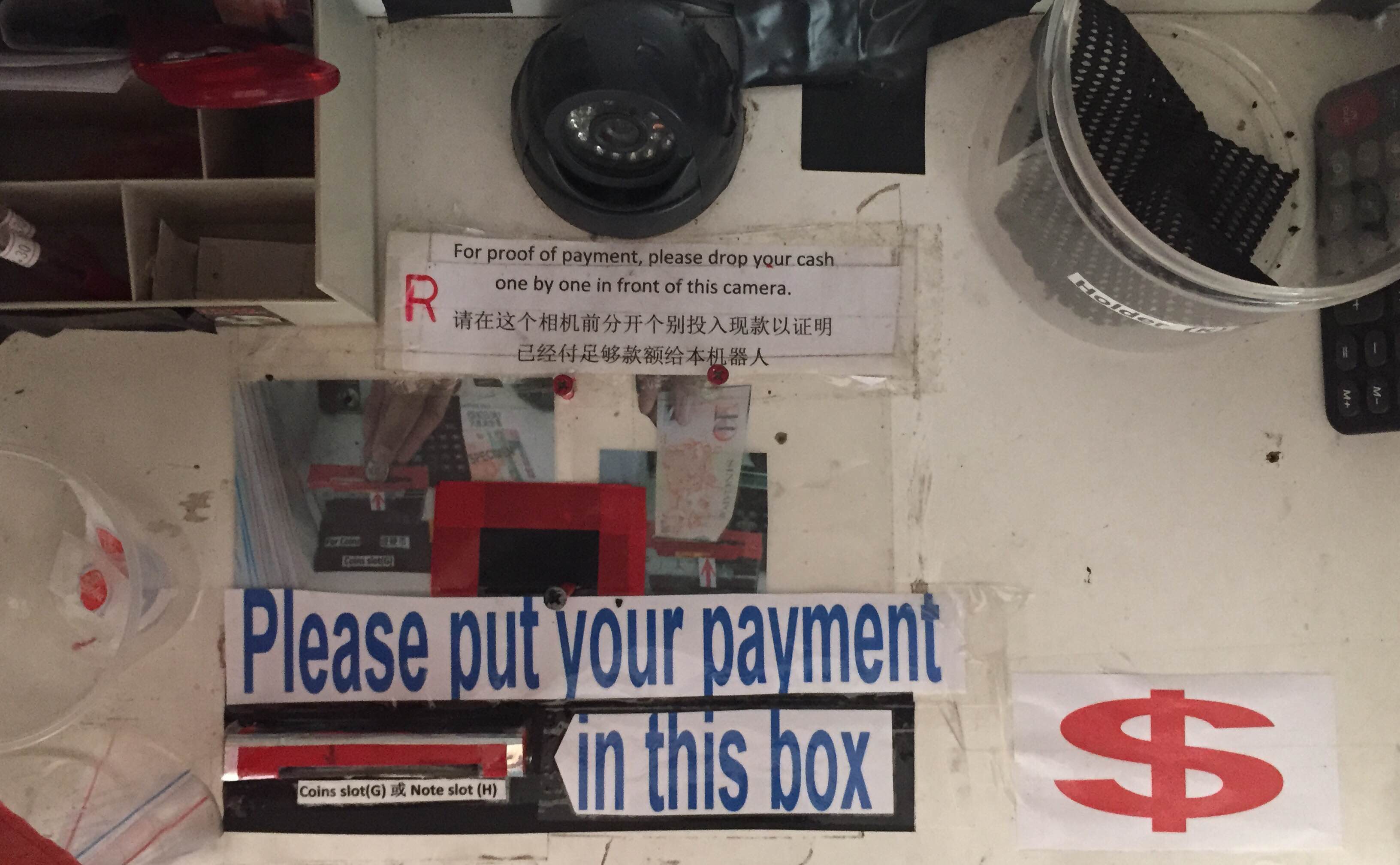A handmade cash register at the front of the shop displays instructions on how to pay for items: check the price tag, show it to any one of the shop's eight closed-circuit television (CCTV) cameras, and place the money into a slot. To get change, press buttons on the register to either get $1 or $0.10 back in coins.