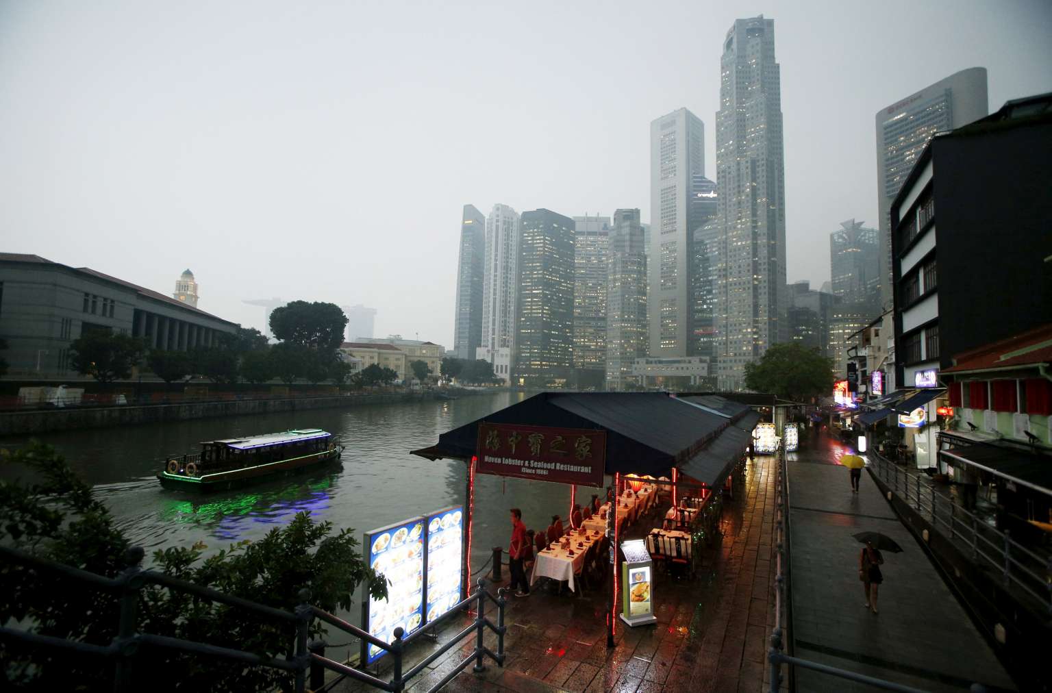 A bumboat passes empty restaurants near the central business district in Singapore on Sept 28, 2015.