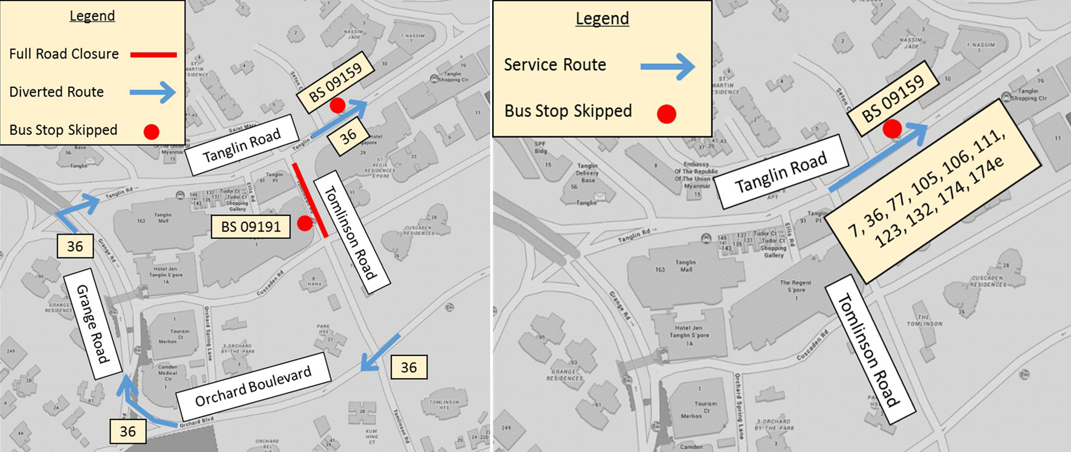 Bus services that usually pass through Tomlinson Road and the Tanglin area will be diverted as some roads and bus stops will be closed or have one-way traffic flow from June 9 to 14.