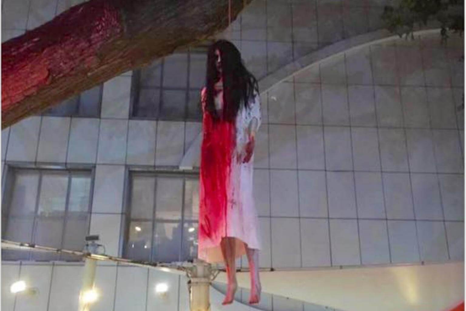 A *Scape spokesman explained that the life-size human figure dressed in a bloodied white robe and hanging by the neck from a tree was installed on Sept 18 as part of publicity efforts for its Halloween event, Museum of Horrors VII: Vengeance.