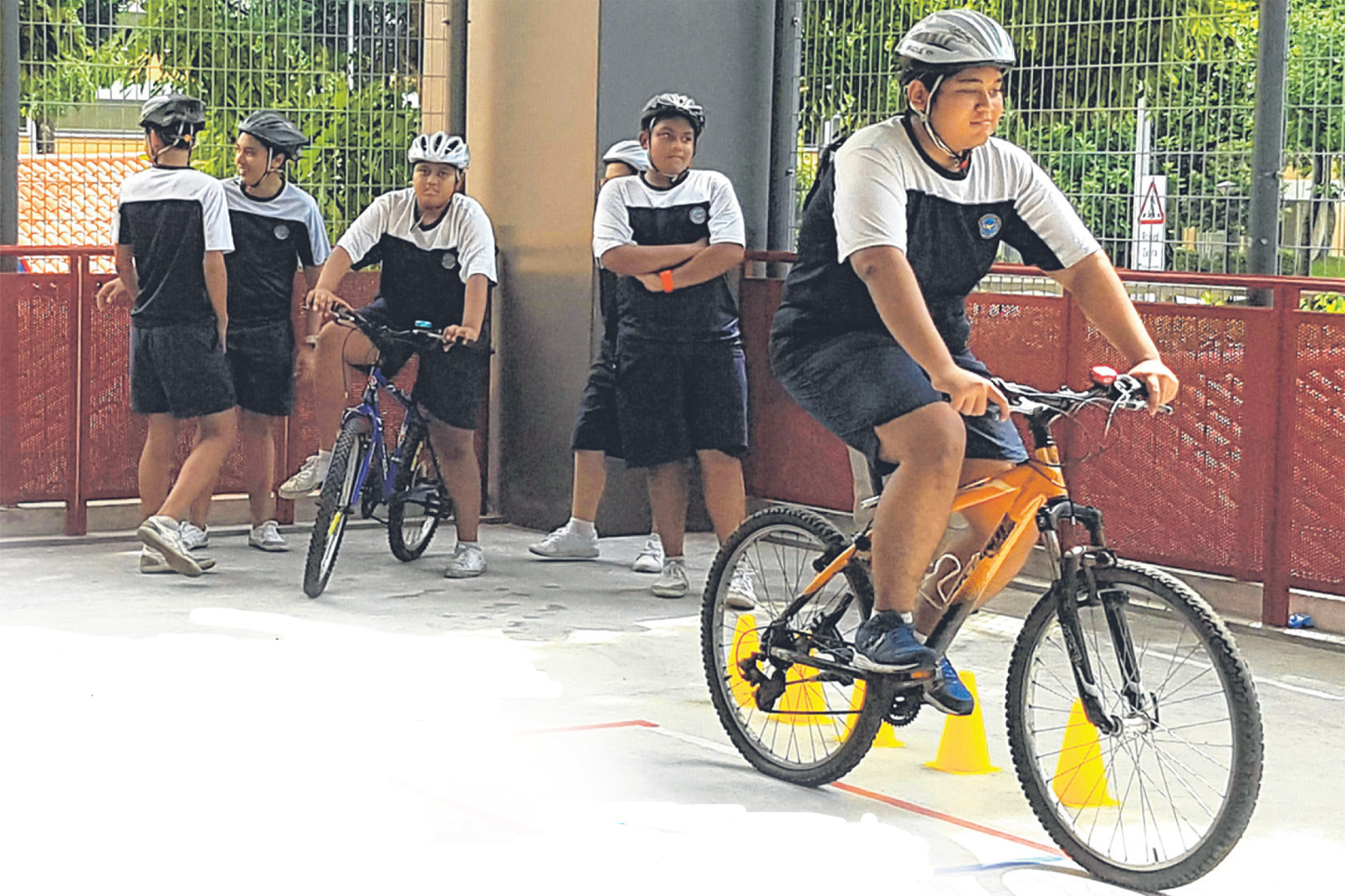 East View Secondary students taking part in a pilot exercise yesterday, where they were taught safe cycling practices and the proper use of cycling infrastructure, among other things.