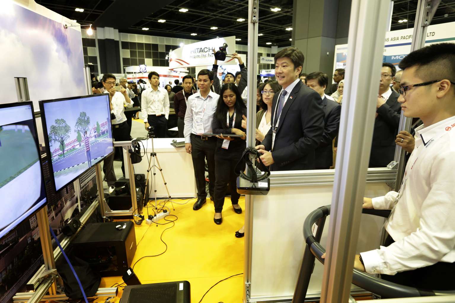 Assistant Professor Xu Hong (on minister's right) showing Senior Minister of State for Transport Ng Chee Meng the walking simulator at the Singapore International Transport Congress and Exhibition 2016 on Oct 19, 2016.