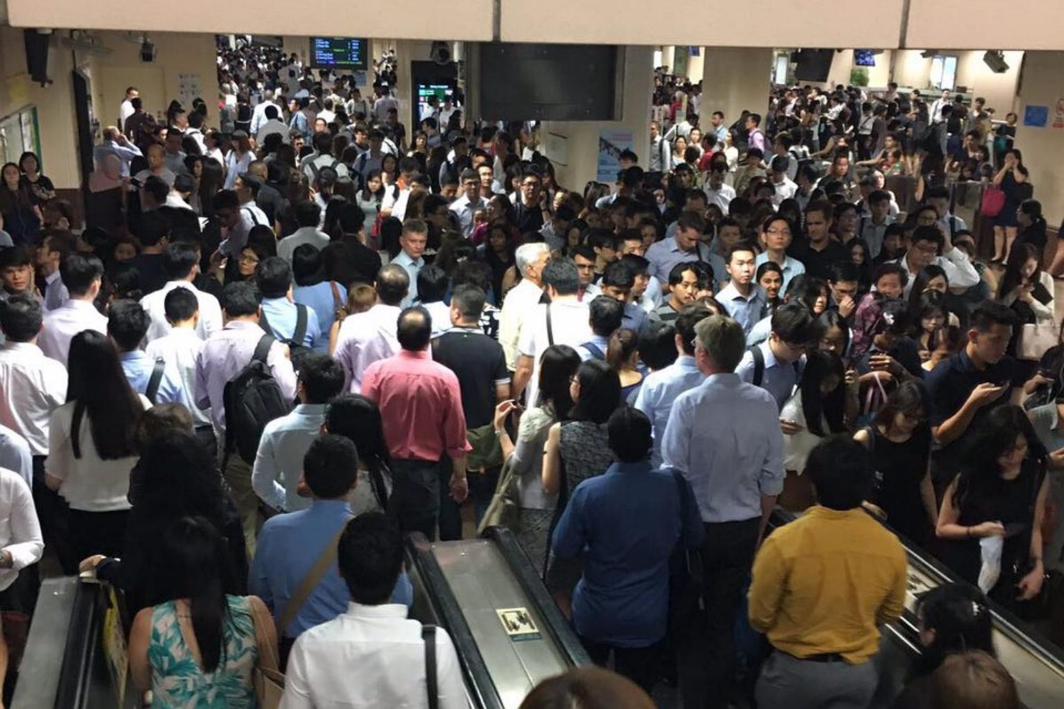 The crowd at Raffles Place station, after a signalling fault delayed services on the East-West Line, on July 10, 2017.