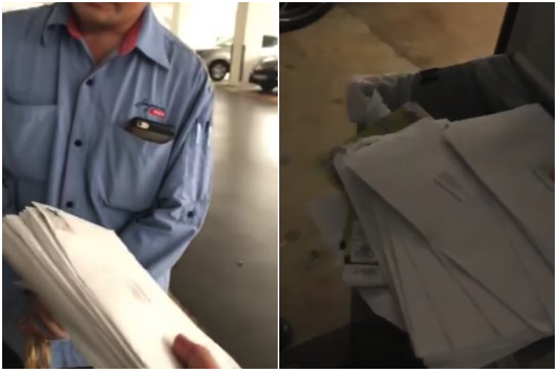 The video taker retorts: "So you threw this stack of beautiful letters into the rubbish bin."