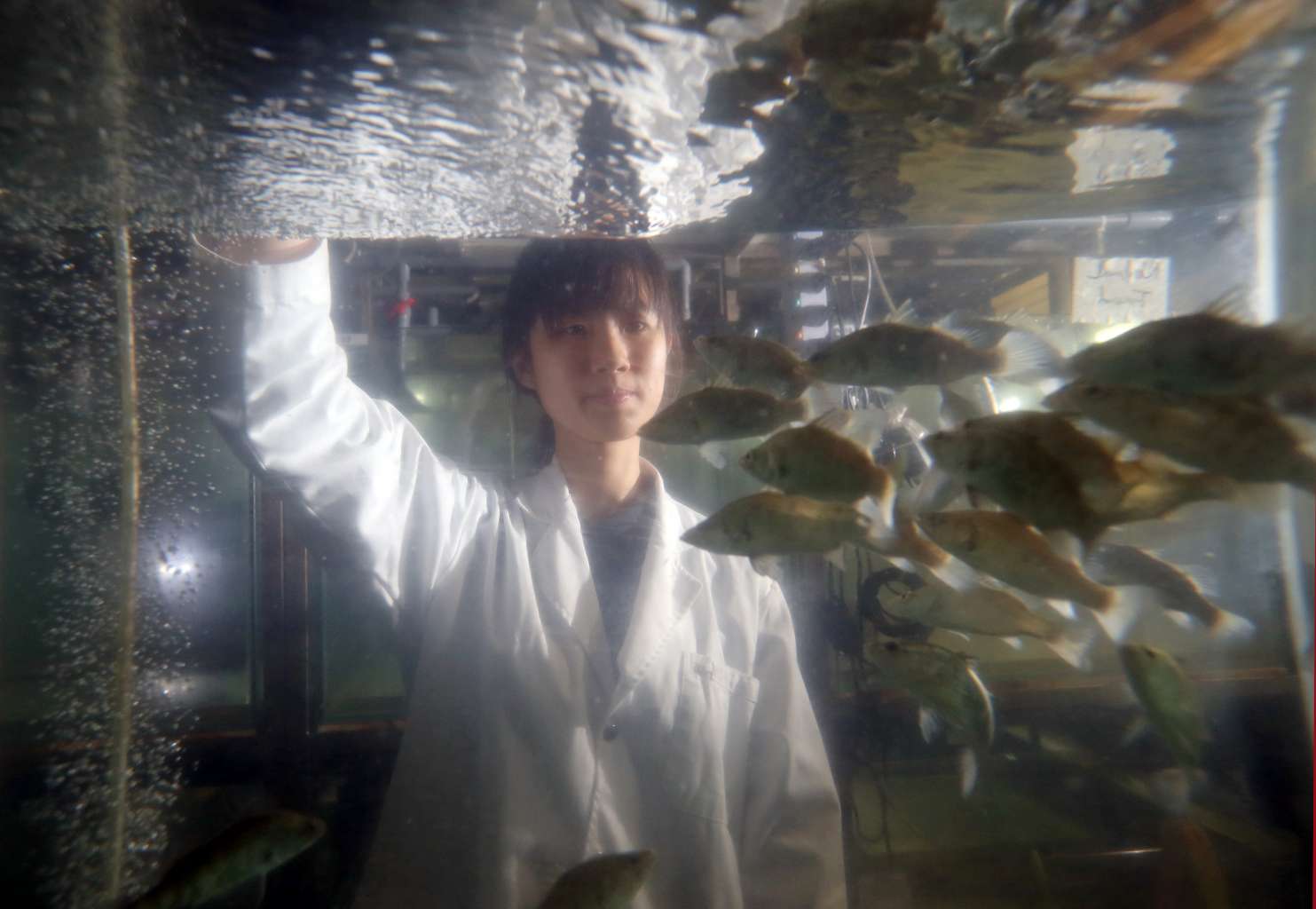 A student in Diploma in Veterinary Technology, feeds Seabass fingerlings at the introduction of the Temasek Polytechnic aquaculture and marine life nutrition course.