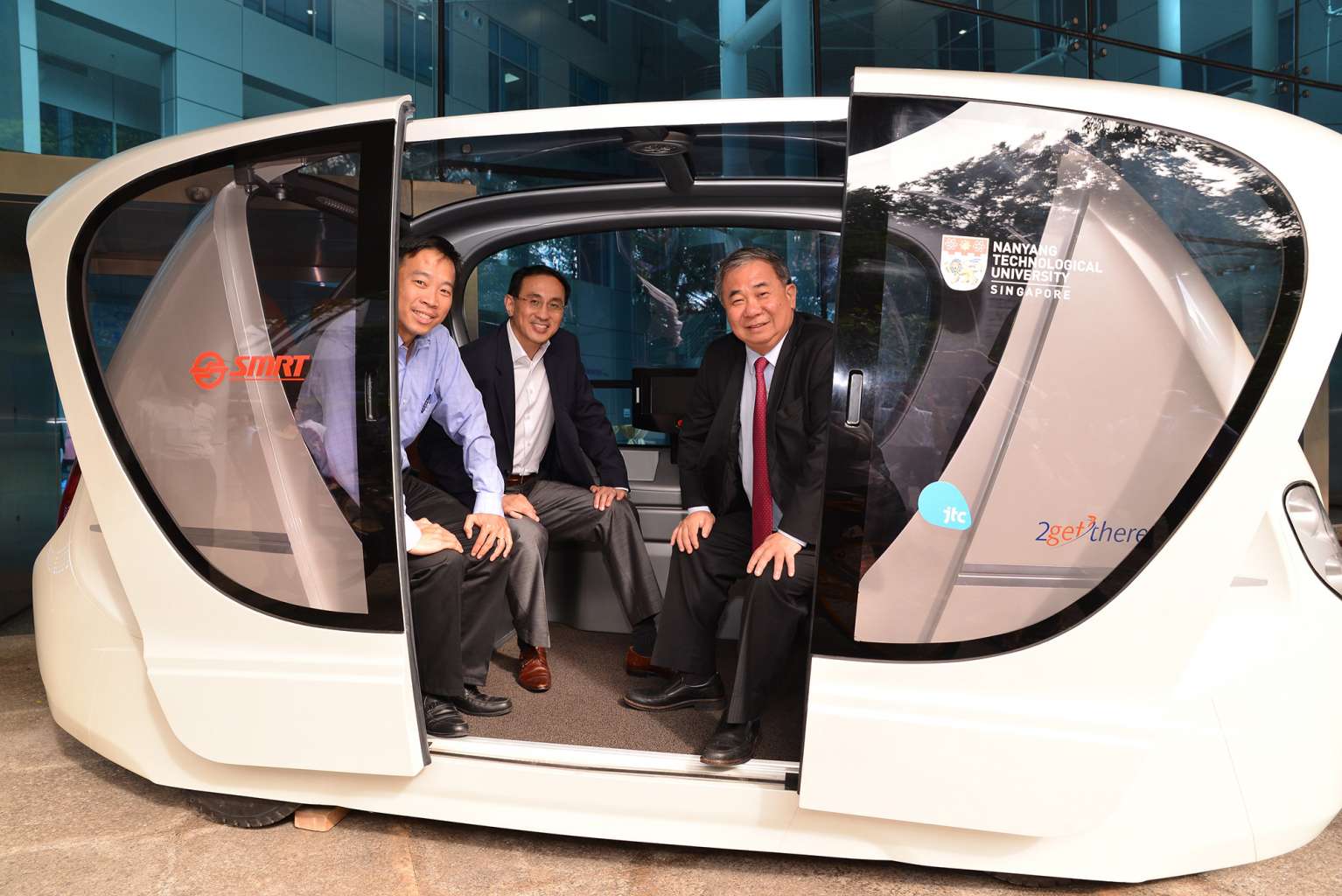 (From left) JTC CEO Png Cheong Boon, SMRT President and Group CEO Desmond Kuek, and NTU Provost Professor Freddy Boey inside a driverless Personal Rapid Transit vehicle.