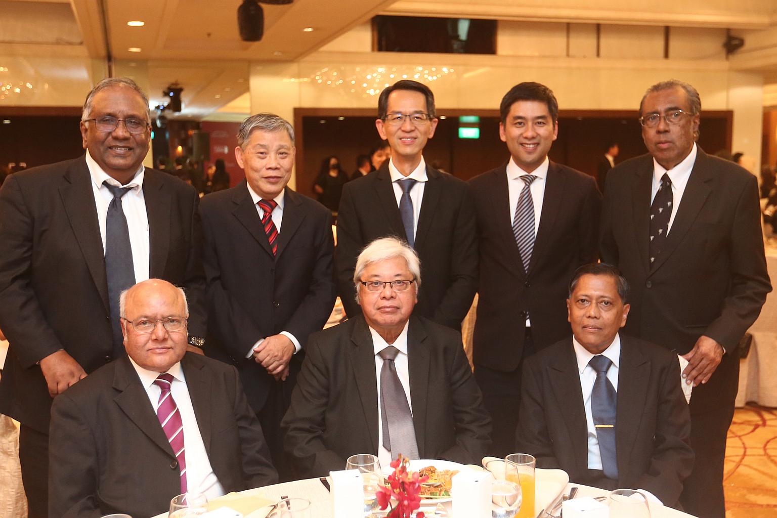 (Clockwise from top left) Mr N K Rajarh, Mr Peter Cuthbert Low, Justice See Kee Oon, Senior Assistant Registrar Edwin San, Mr Singa Retnam, Mr Elengovan (who is receiving the award on behalf of the late Mr P Suppiah), Mr Mohamed Muzammil Mohamed and Mr Ram Goswami, at the Judiciary Volunteers Appreciation Dinner on Oct 11, 2019.