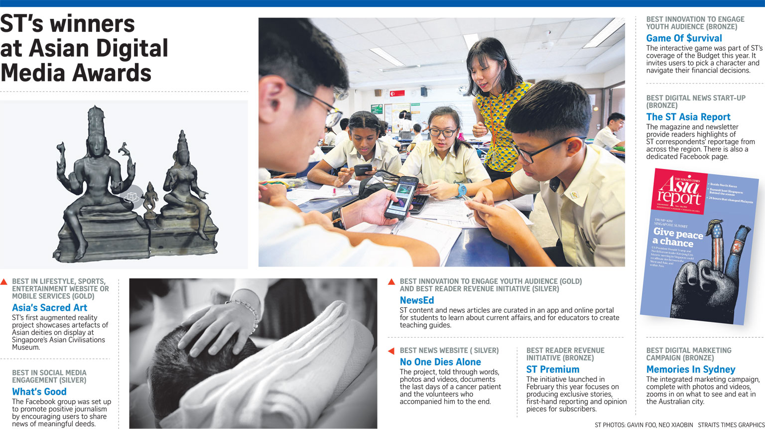 ST also won the silver award in social media engagement for its Facebook group, What's Good, which aims to promote positive journalism by encouraging users to share news of good deeds or heartwarming stories.