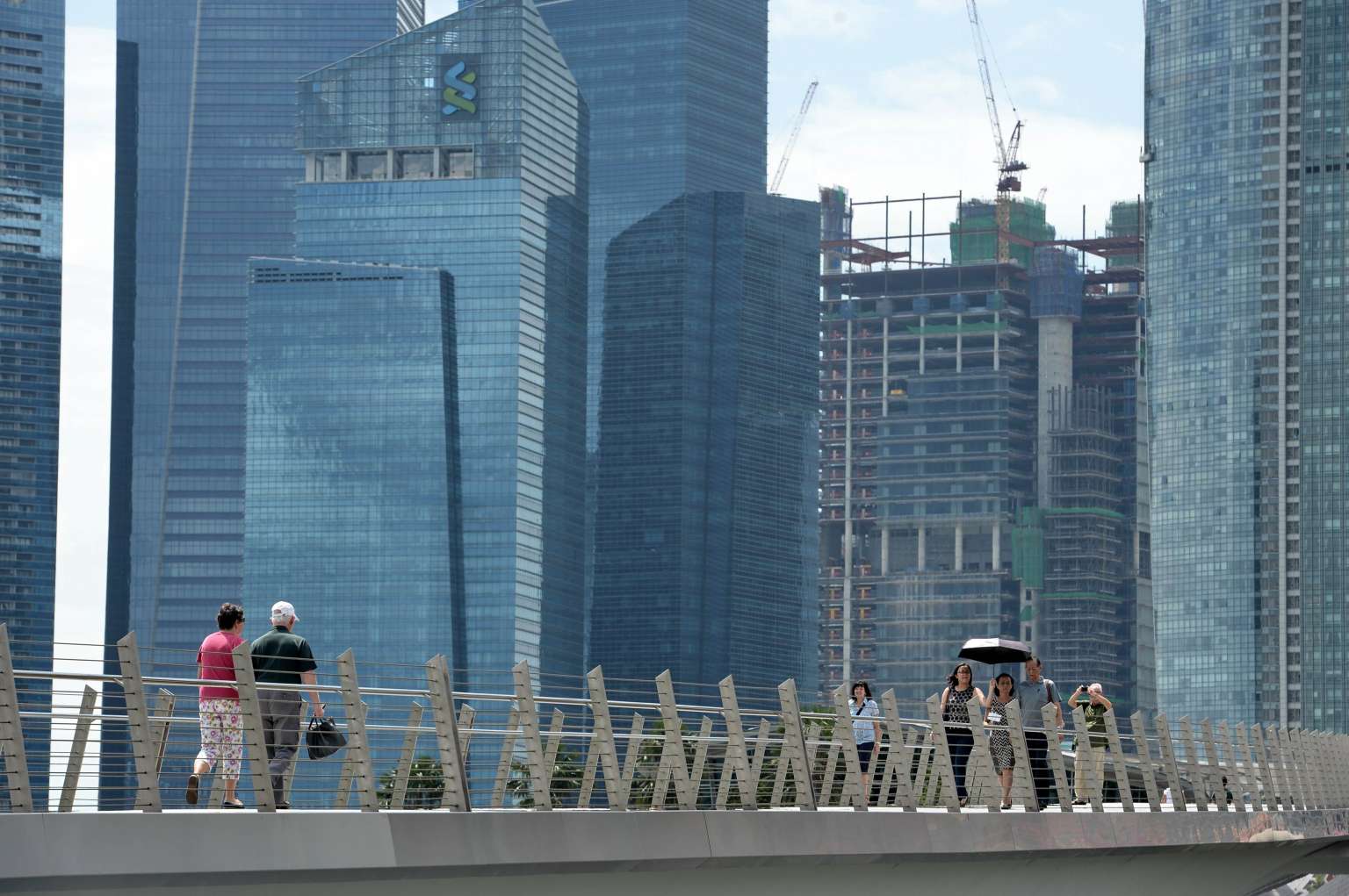 People walk towards the financial district over the river in Singapore on Jan 11, 2016.