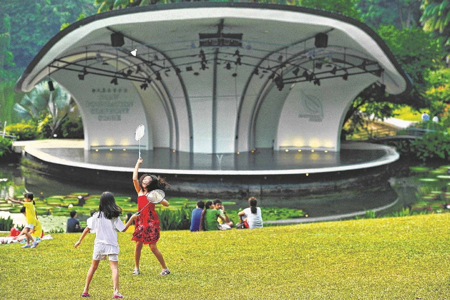 Claire Ng (red), 10, and Kelly Ng, eight, having a game of badminton at Palm Valley in front of the Symphony Stage at the Singapore Botanic Gardens.