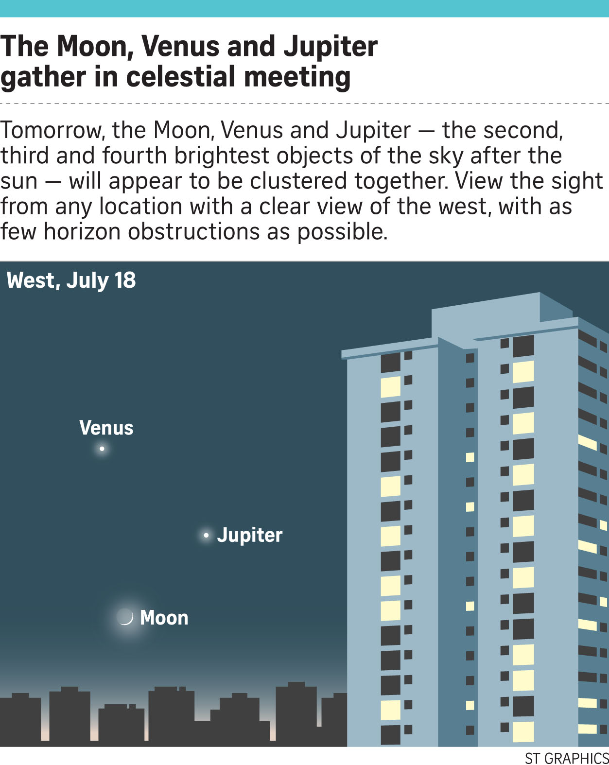 Commenting on tomorrow's event, Mr Lim said: "You have a thin crescent moon forming a triangle with two bright planets, Venus and Jupiter, in the western sky.